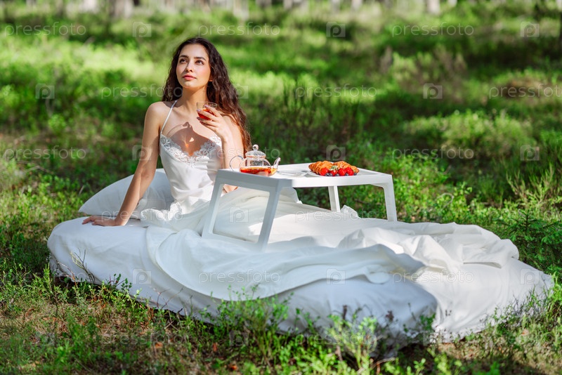 Молодая женщина завтракает в постели в летнем лесу