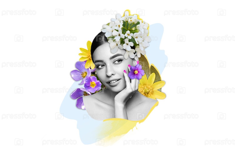 Абстрактный художественный коллаж молодой красивой женщины с цветами на голове