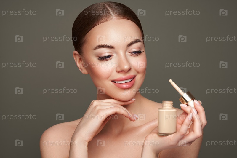 Портрет красивой молодой женщины с бутылкой основания