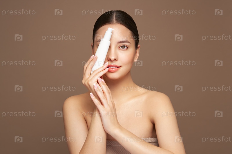 Красивая женщина с бутылкой крема для увлажнения