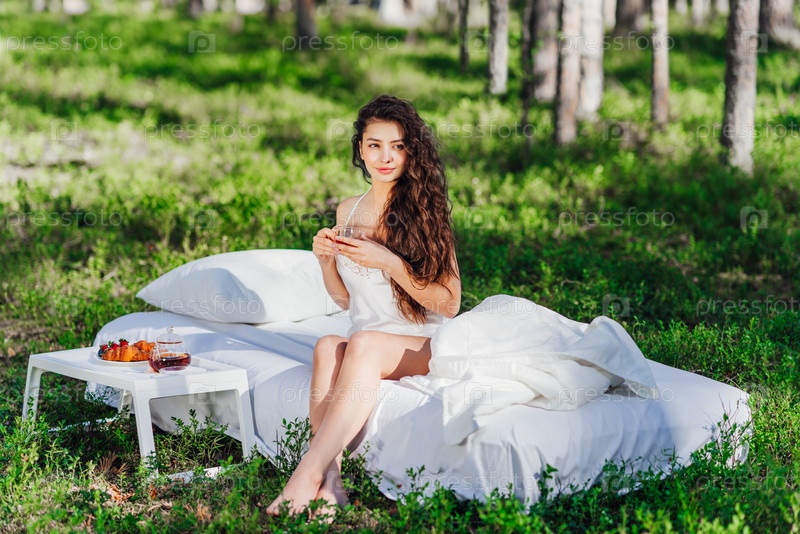 Молодая женщина завтракает в постели в летнем лесу