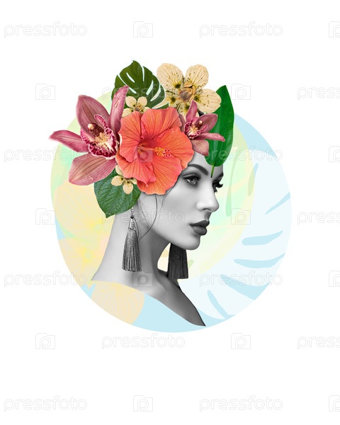 Абстрактный художественный коллаж молодой красивой женщины с цветами на голове