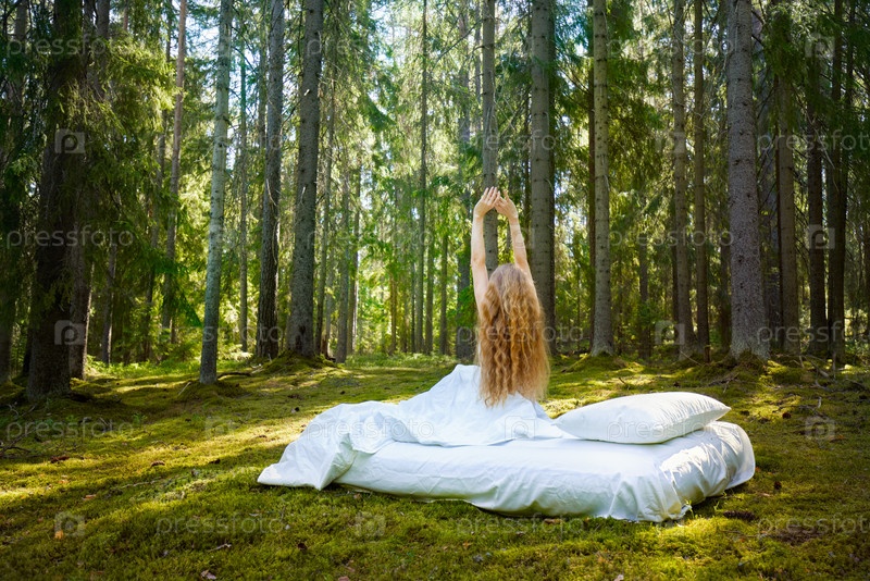 Девушка просыпается в летнем лесу
