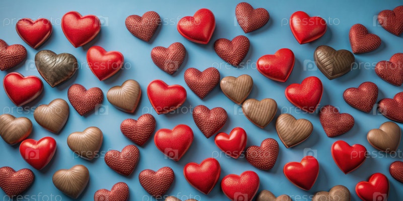 Красные сердца разбросаны на красочном фоне для праздничного торжества