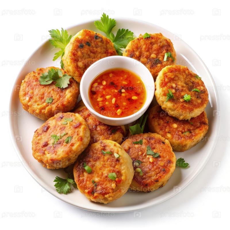 Торты Темпе подаются со сладким чили-соусом на тарелке за обеденным столом