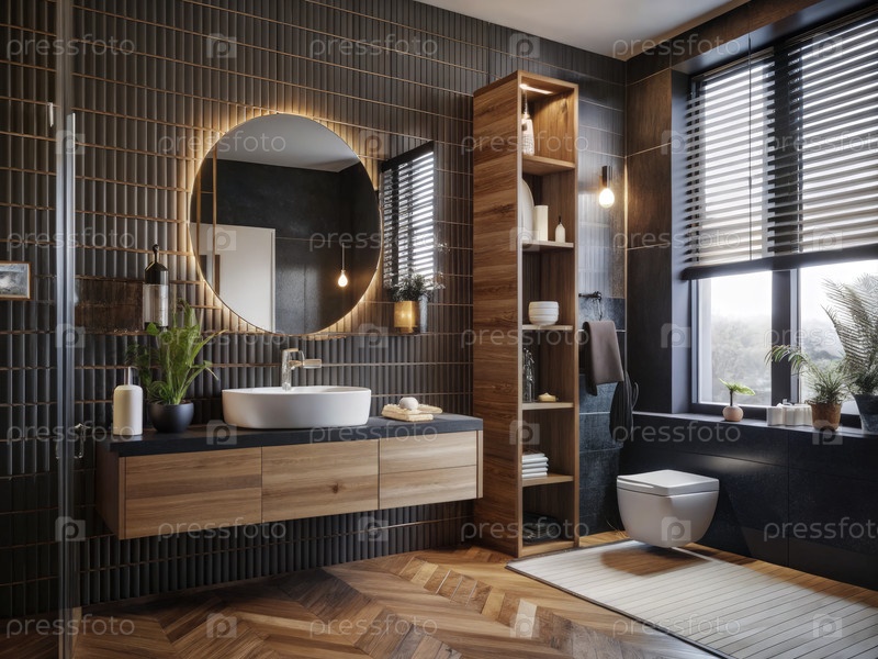 Стильная современная ванная комната с деревянными акцентами и функциями естественного освещения. генеративный ИИ