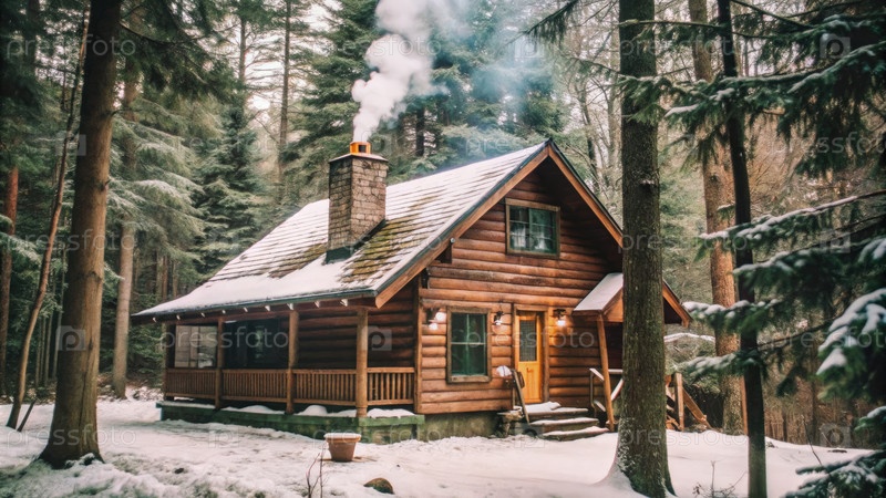 Уютный домик в снежном лесу с дымом, извивающимся из дымохода