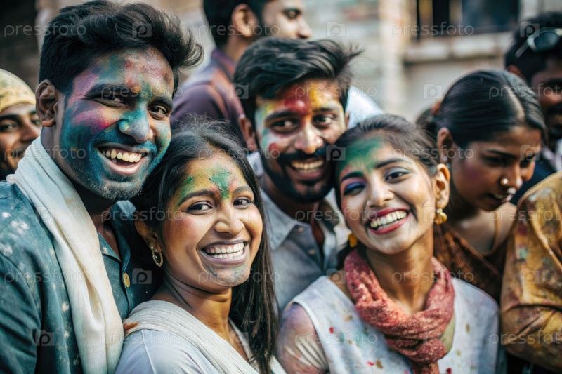 Счастливый индийский народ празднует фестиваль цветными порошками в радостной атмосфере