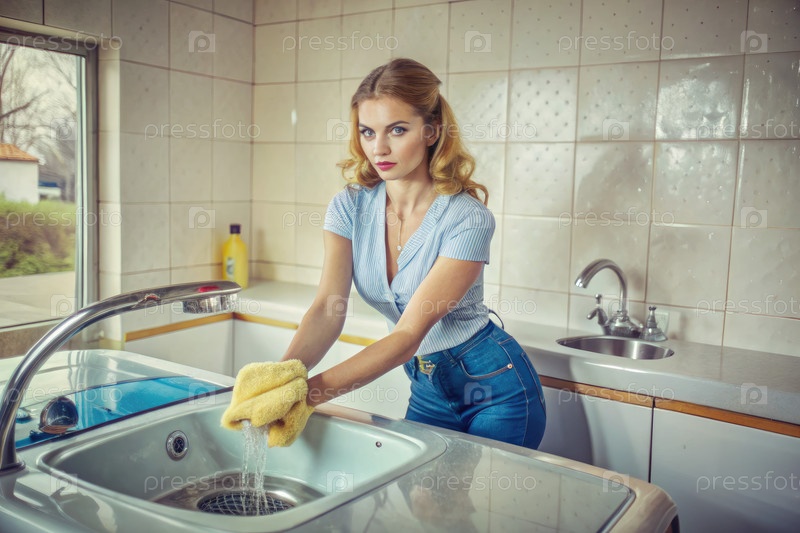 Женщина, убирающая посуду в яркой кухне днем с сосредоточенным выражением лица