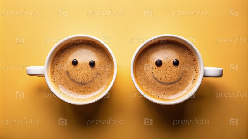 Две чашки для кофе сидят рядом, каждая из которых украшена улыбкой, созданной из кофейной пены