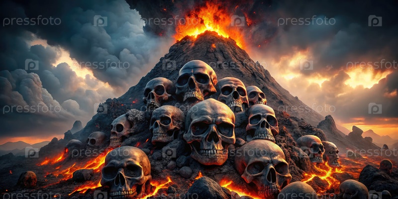 Темный вулканический ландшафт с сожженными черепами под огненным небом на закате