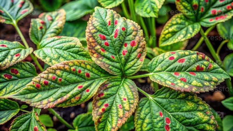 Листья растения уртикария, показывающие отличительные красные пятна в пышной садовой обстановке