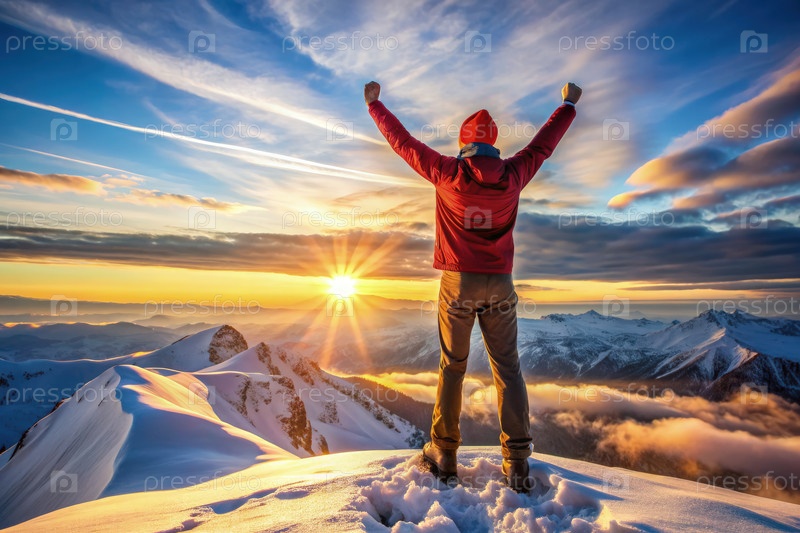 Мужчина-победитель празднует победу на восходе солнца на вершине горы