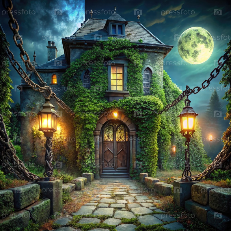 Таинственный особняк, покрытый плющом и освещенный фонарями под полнолунием