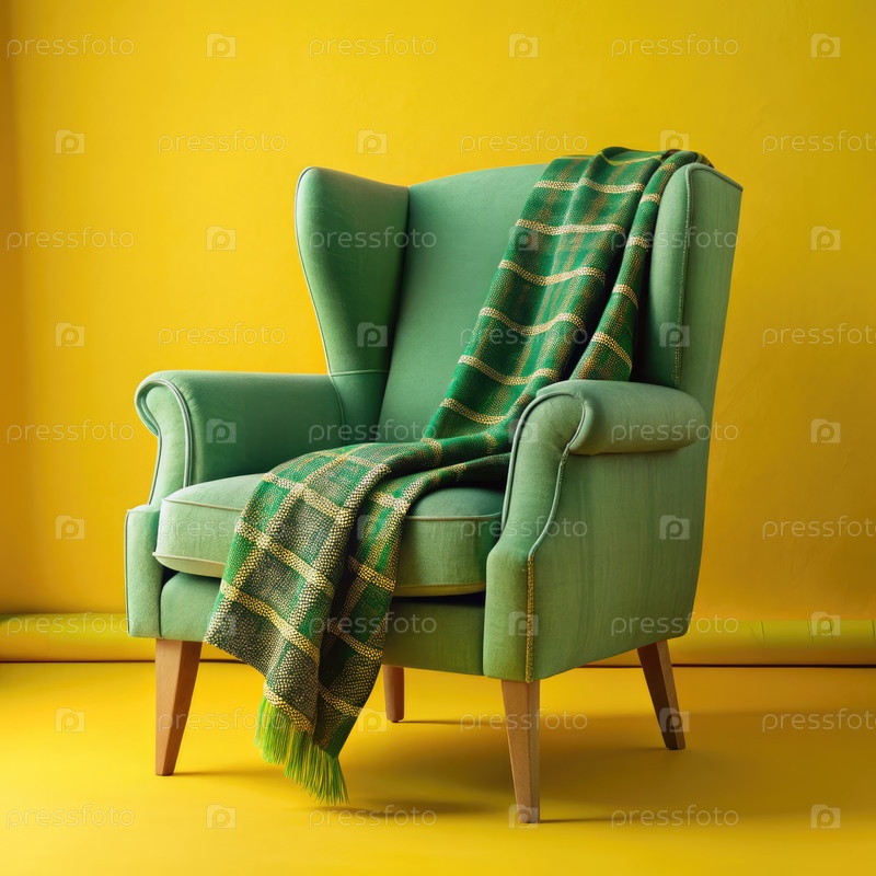 Уютный зеленый кресло, покрытое ковровым одеялом на ярко-желтом фоне
