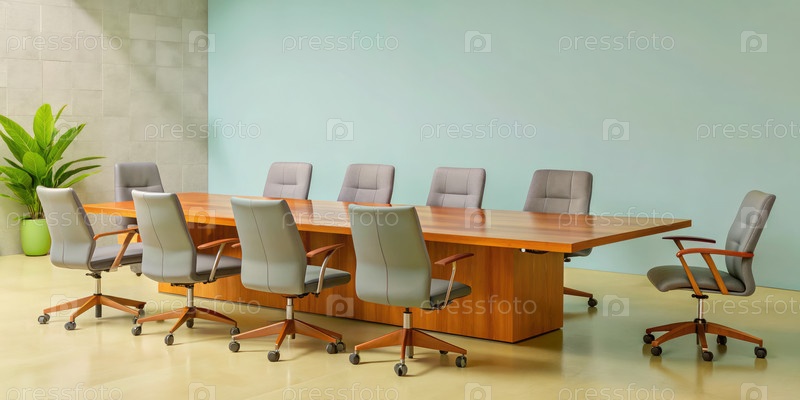 Современный конференц-зал с деревянным столом и серыми стульями для совместных встреч