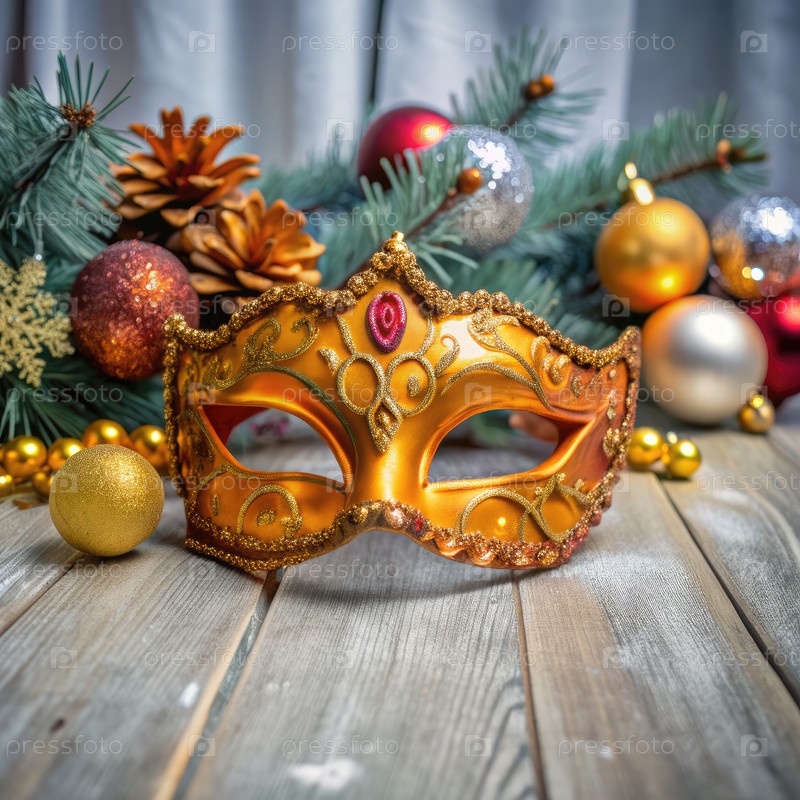 Декоративная золотая маска с праздничными украшениями на деревянной поверхности во время каникул