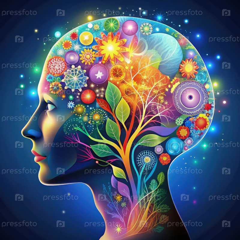 Цветная иллюстрация мозга, представляющая психологические понятия и эмоции