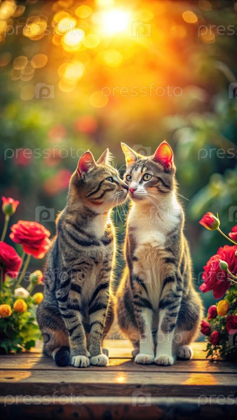 Романтический момент между двумя кошками, окруженными цветущими цветами на закате