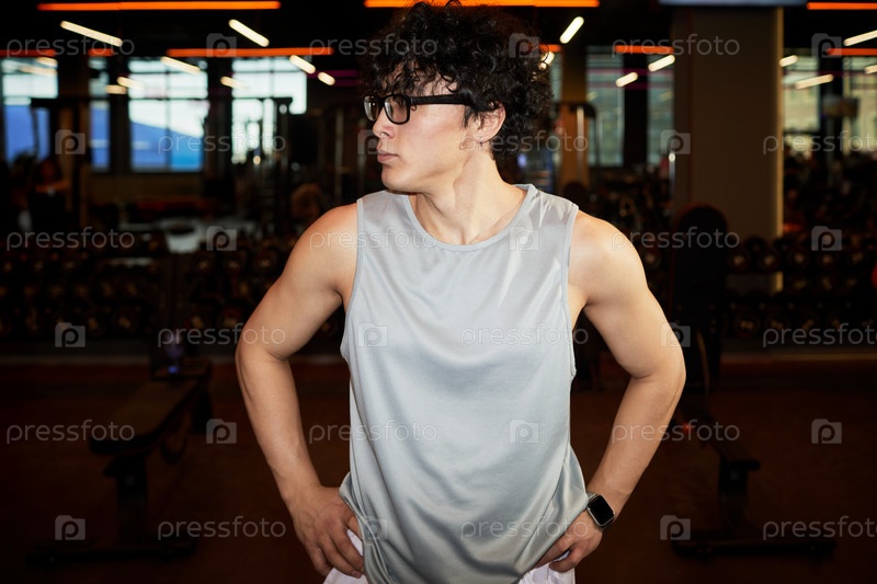 Мужчина с очками, стоящий в тренажерном зале для мотивации к фитнесу