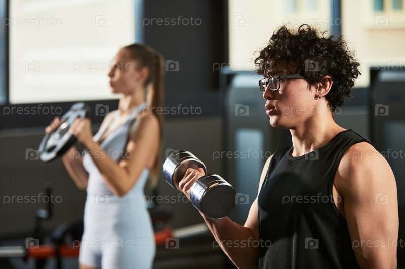 Взрослый мужчина, занимающийся гантельками в тренажерном зале для фитнес-тренингов