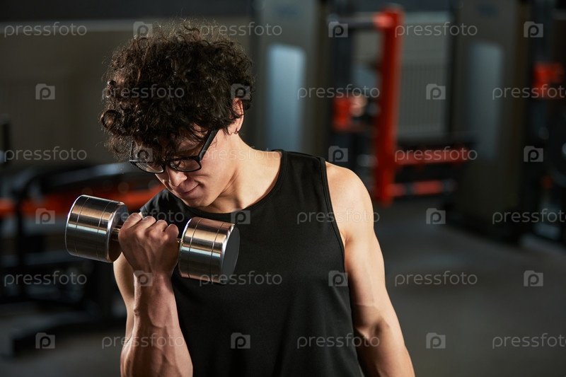 Мужчина поднимает гантели для силовых тренировок в спортзале