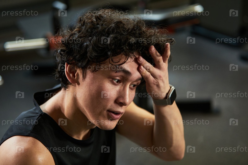 Азиатский мужчина отдыхает после тренировки в тренажерном зале для восстановления фитнеса