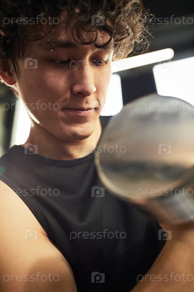 Взрослый мужчина поднимает гантели во время силовой тренировки