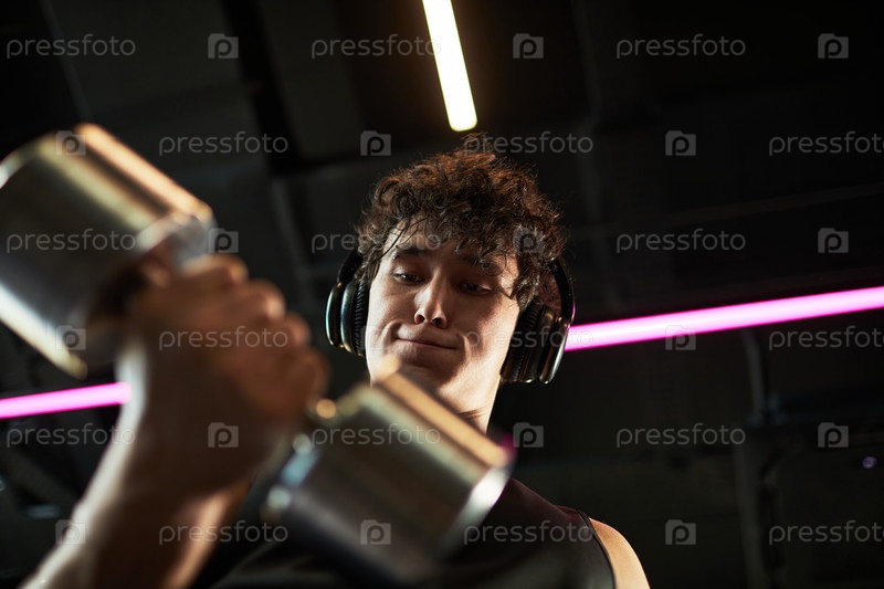 Подросток поднимает гантели во время силовых тренировок в спортзале