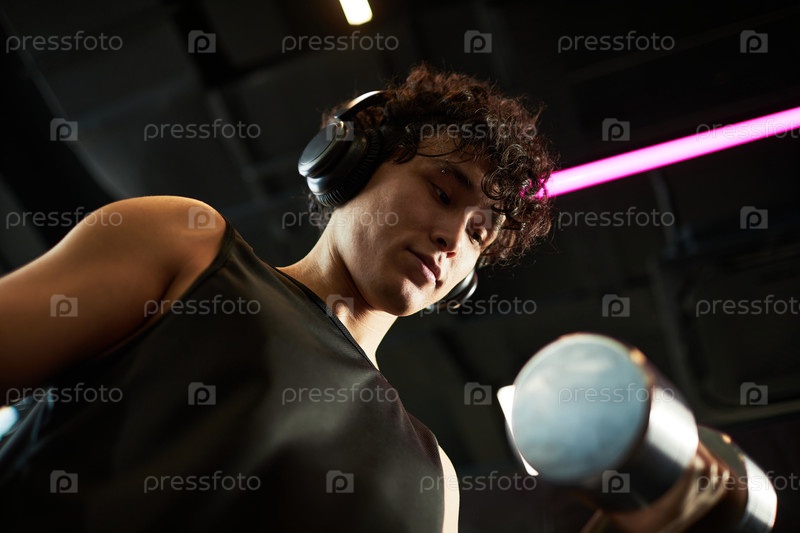 Взрослая женщина занимается с помощью гантеля и наушников в спортзале