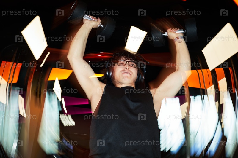 Мужчина-взрослый поднимает гантели во время силовых тренировок в спортзале