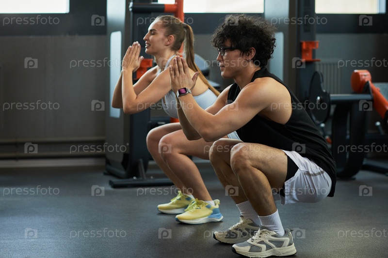 Мужчина и женщина, выполняющие приседания для фитнес-тренингов взрослых
