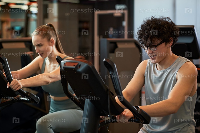 Мужчина и женщина занимаются на стационарных велосипедах в спортзале для взрослых
