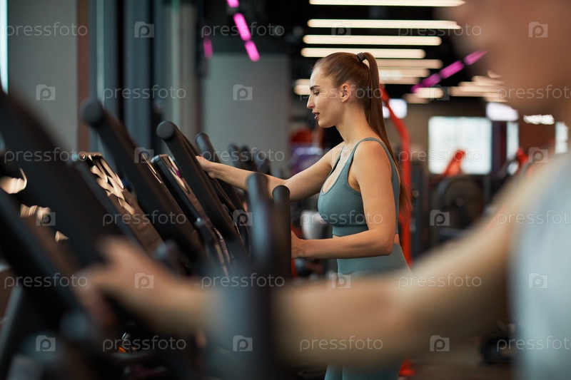 Взрослая женщина тренируется на эллиптическом тренере в фитнес-центре