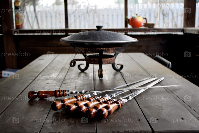 Садж на подставке и шампура на деревянном столе