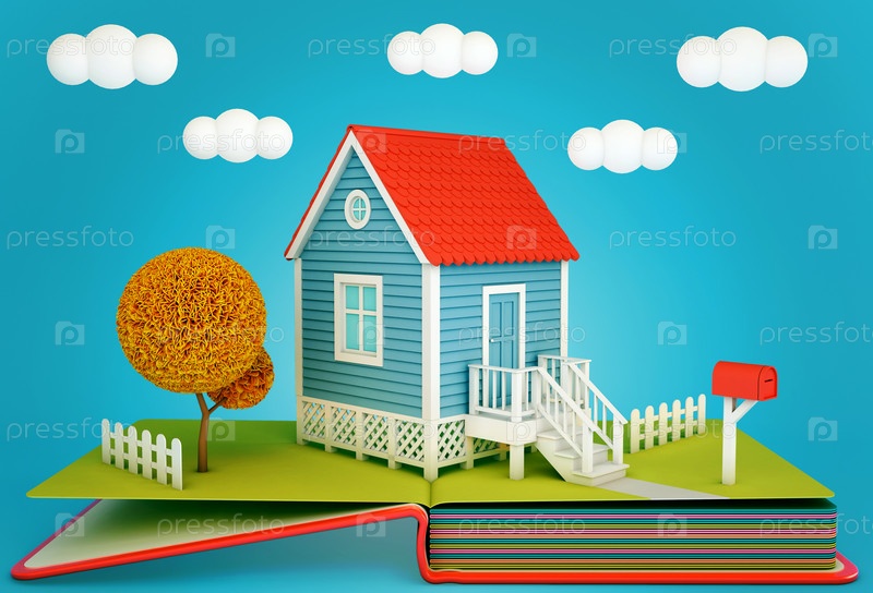 Всплывающая книга с пригородным домом и деревом.Осеннее время. 3D-рендеринг
