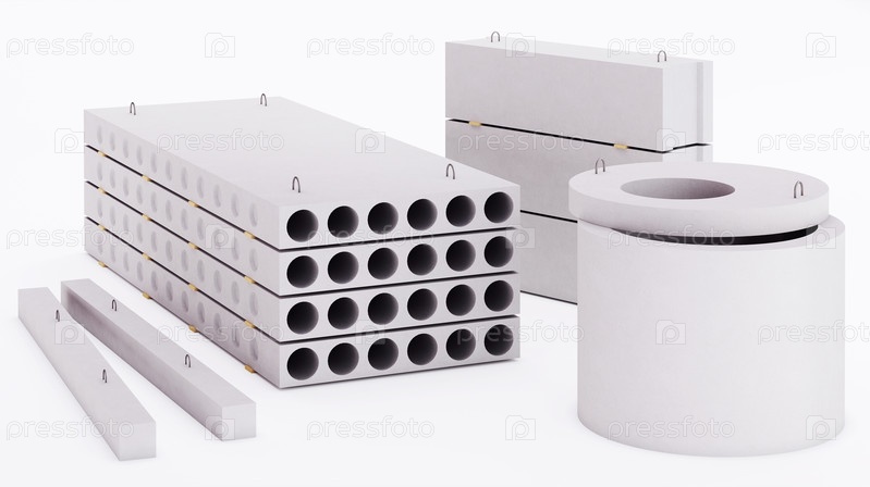 Набор железобетонных изделий на белом фоне. 3D-рендеринг