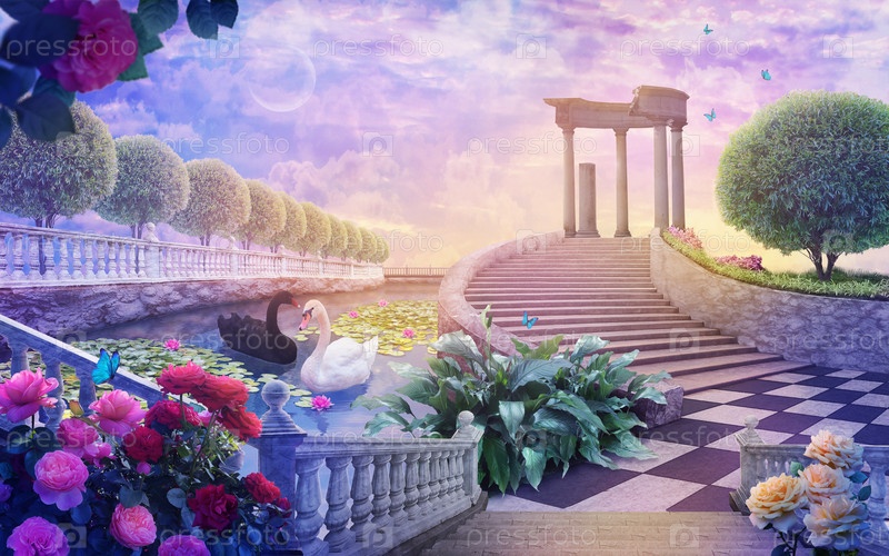 Красивый летний пейзаж страны чудес с рожами и прудом с лилиями и лебедями. фотоискусство, коллаж