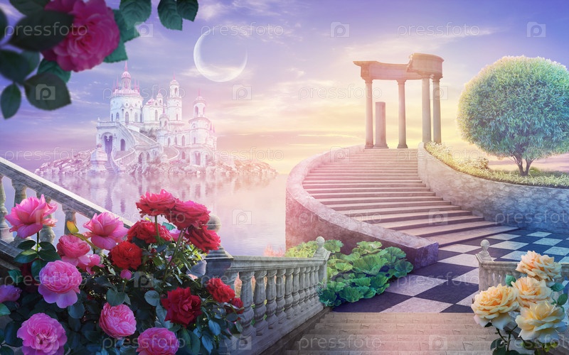 Красивый летний ландшафт страны чудес с розами и старым замком