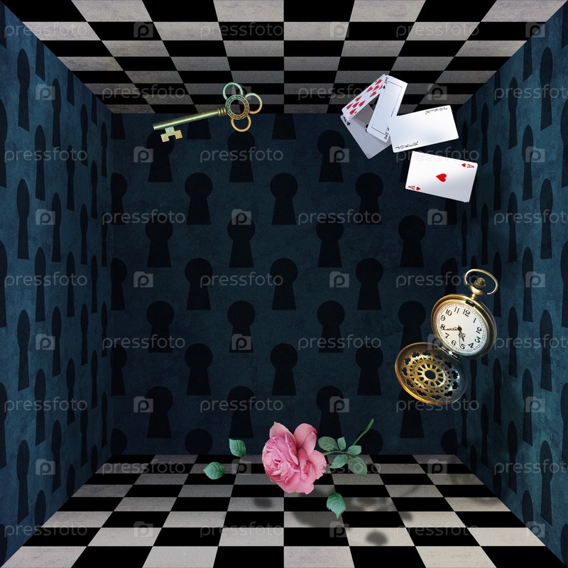 Комната мира чудес. Летающие игровые карты, часы, ключ на фоне зеленых стен и шахматного пола. Безумная чайная вечеринка. Красочный фон для фотосессий и вечеринок