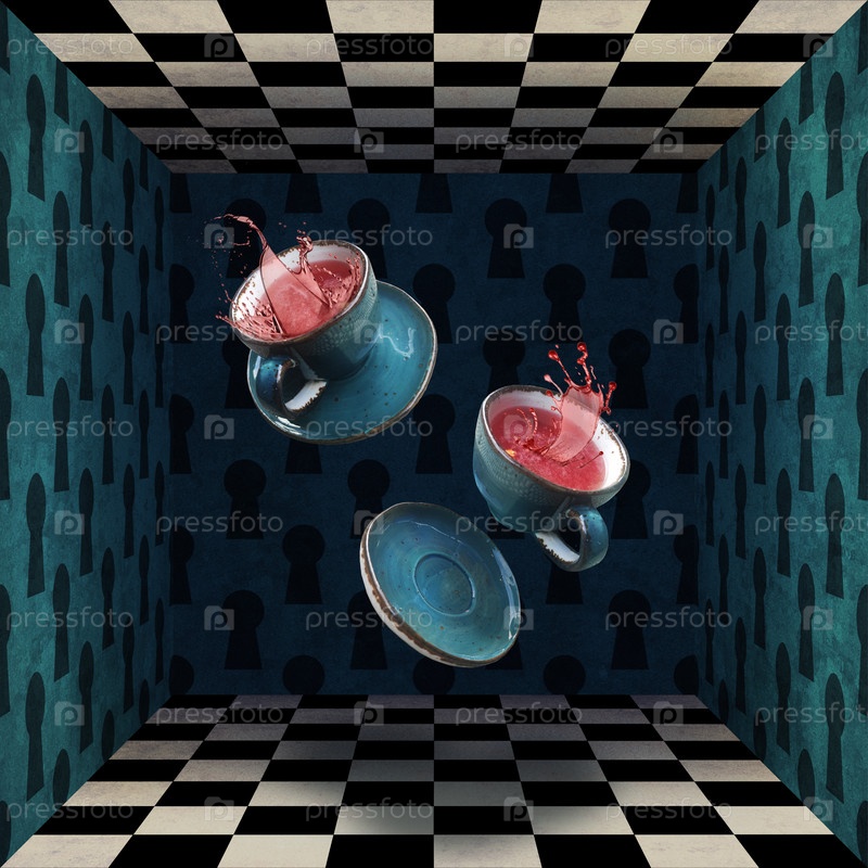 Комната мира чудес. Летающие чайные чашки на фоне зеленых стен и шахматного пола. Безумная чайная вечеринка. Красочный фон для фотосессий и вечеринок