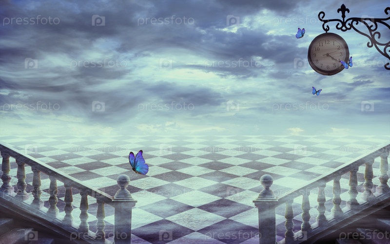 Фантастический мистический фон с бесконечной шахматной доской и часами. туманный сумерки в стране чудес