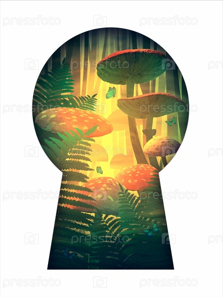Силуэт ключевой дыры на белом фоне и фантастический ландшафт леса страны чудес с дорогой, грибами, папоротниками и бабочками
