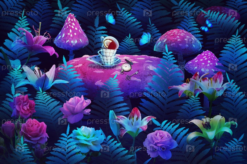 Фантастический ландшафт леса страны чудес с грибами и цветами. сумасшедшая чайная вечеринка. иллюстрация