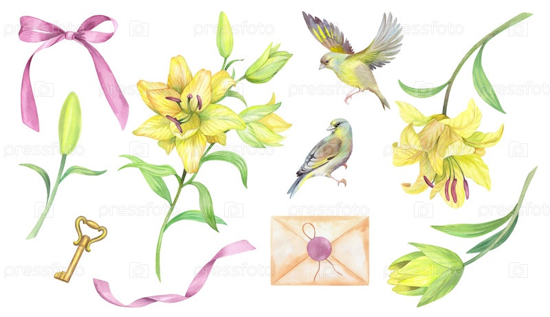 Набор желтых лилий, лука, ленты, конверта, птиц и ключа. иллюстрация ручной акварели. для дизайна упаковки, карточек, обложки, печатных изображений, этикеток на продуктах и ткани