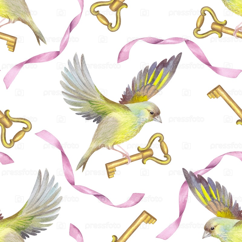 Бесшовный рисунок птицы с винтажным ключом и розовой лентой. Илюстрация ручной акварели. Для дизайна упаковки, карточек, обложки, печатных изображений, этикеток на продуктах и ткани