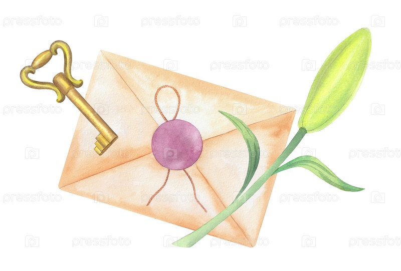 Состав конверта, лилии и ключа. Иллюстрация ручной акварели. Для дизайна упаковки, карточек, обложки, принтов, этикеток на продуктах и ткани