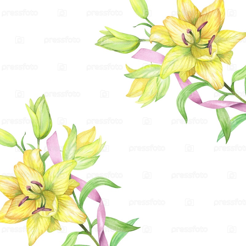 Угловая рама с желтыми лилиями и розовой лентой. иллюстрация ручной акварели. для дизайна упаковки, карточек, обложки, принтов, этикеток на продуктах и ткани