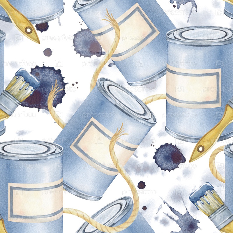 Бесшовный акварельный рисунок с баночками краски, кистями, ютовой веревкой и синими пятнами на изолированном фоне