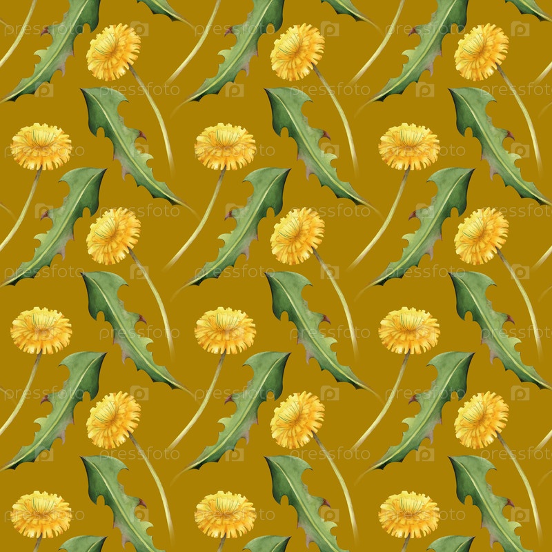 Бесшовный акварельный рисунок одуванчика с желтыми цветами и зелеными листьями на горчичном фоне